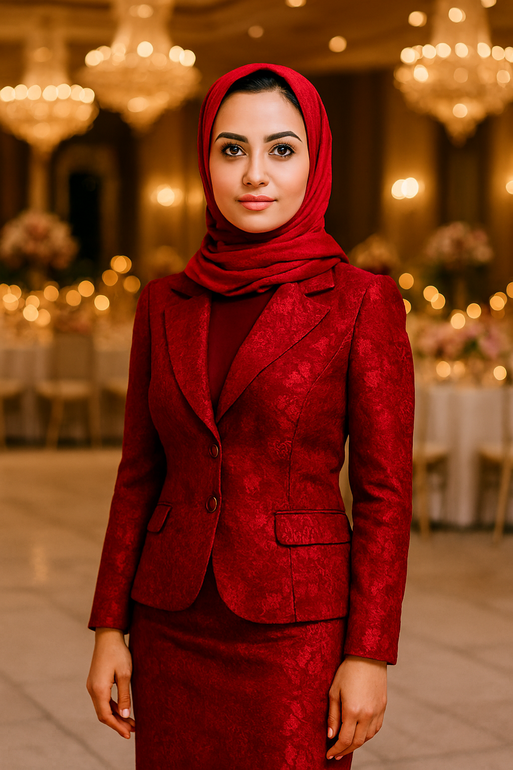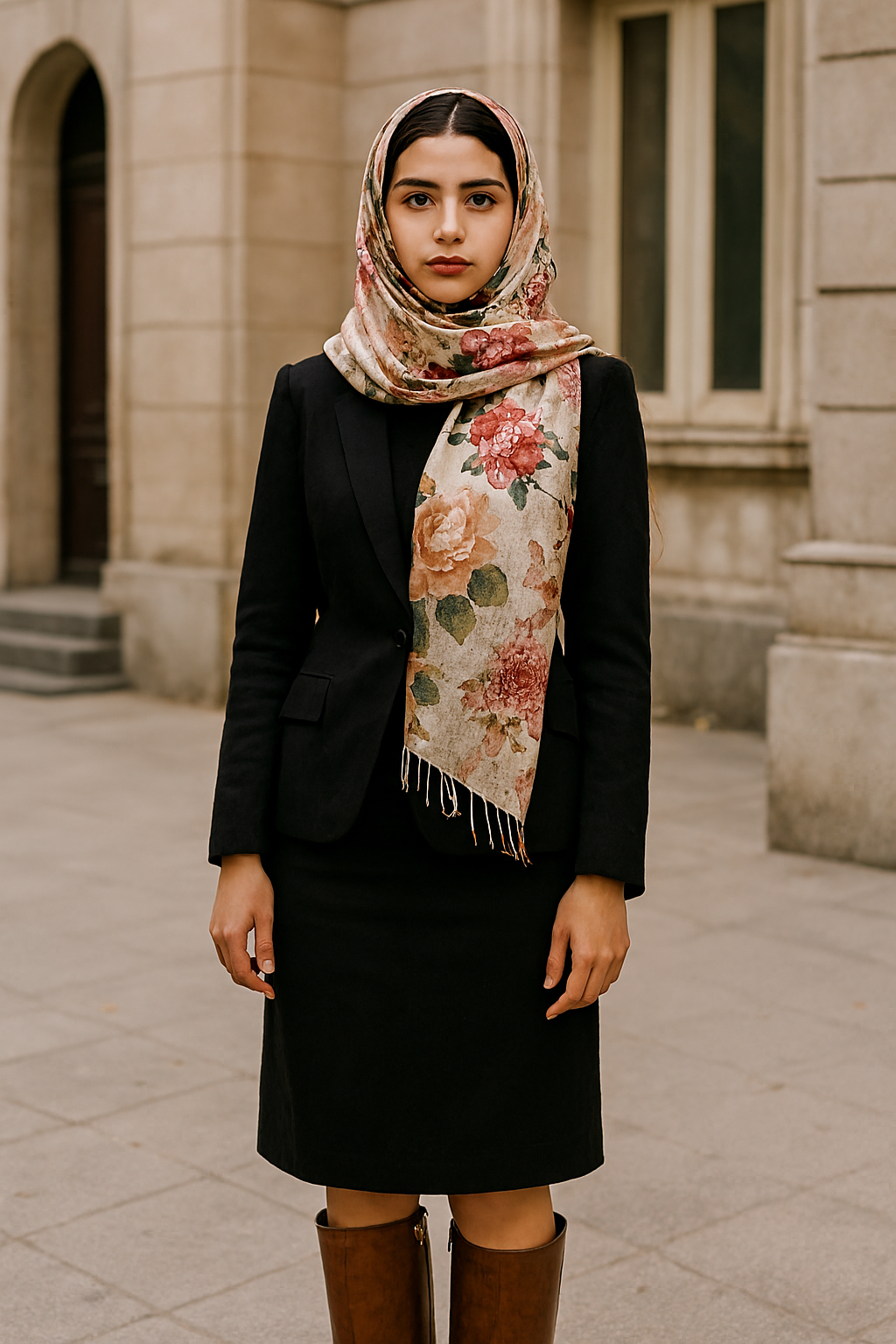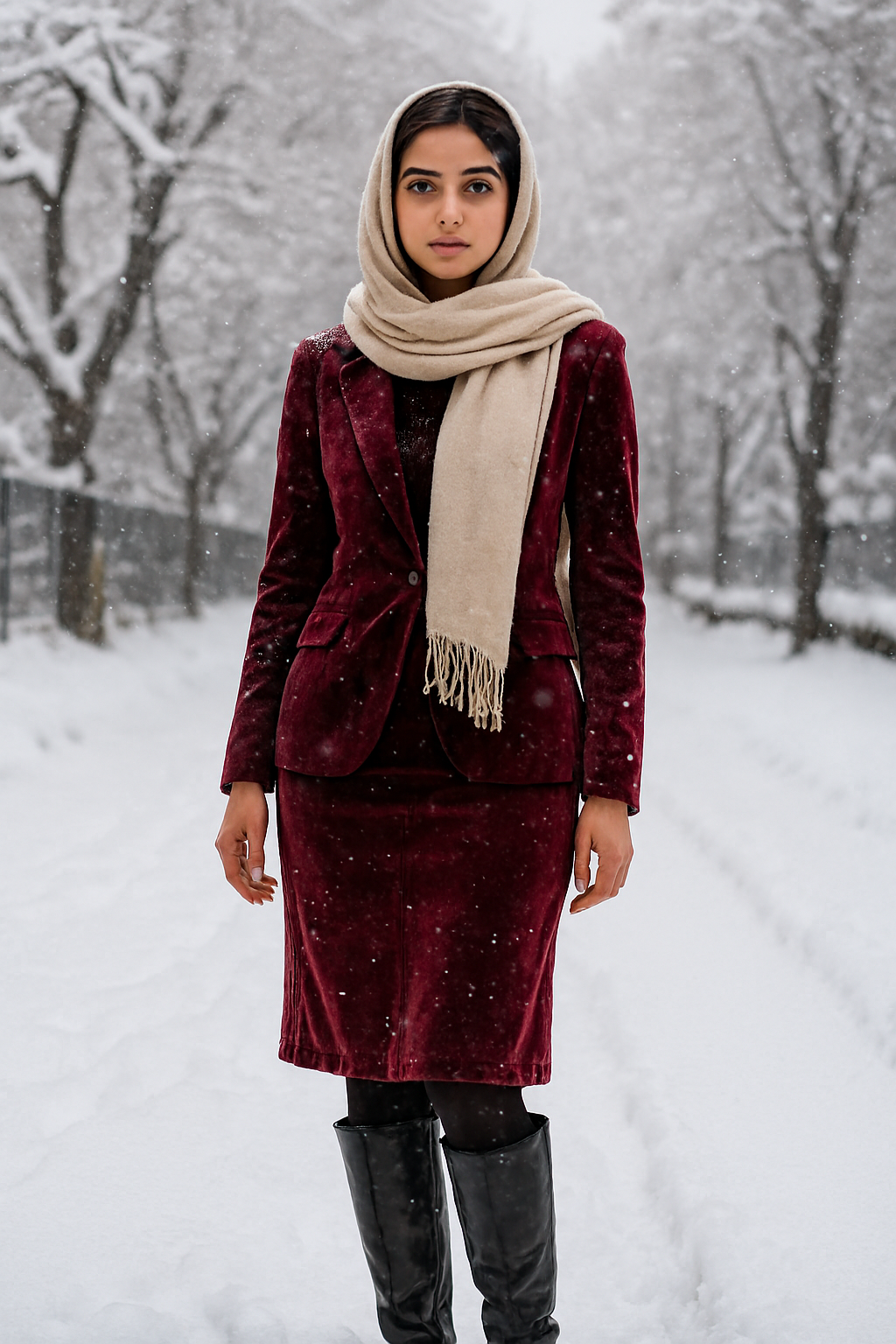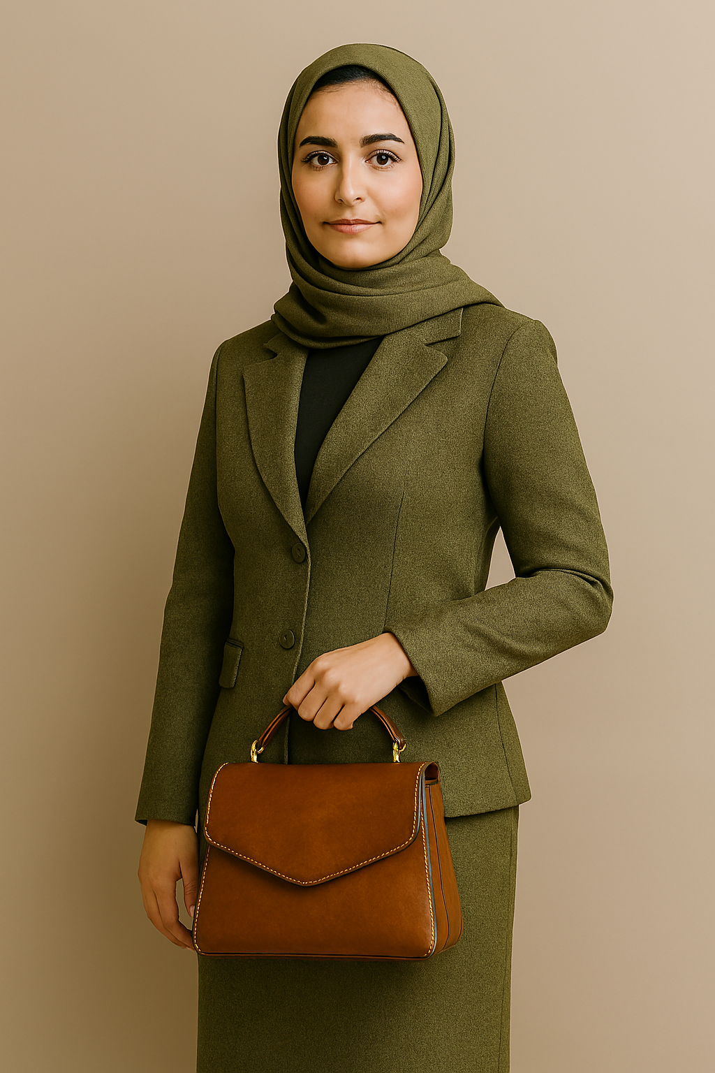 ست شیک، احساس قدرت میدهد. در ایران، بانوان hijabi با کت دامن modest، نماد مدرن هستند. روانشناسی مد: رنگ گرم = انرژی زمستانی.