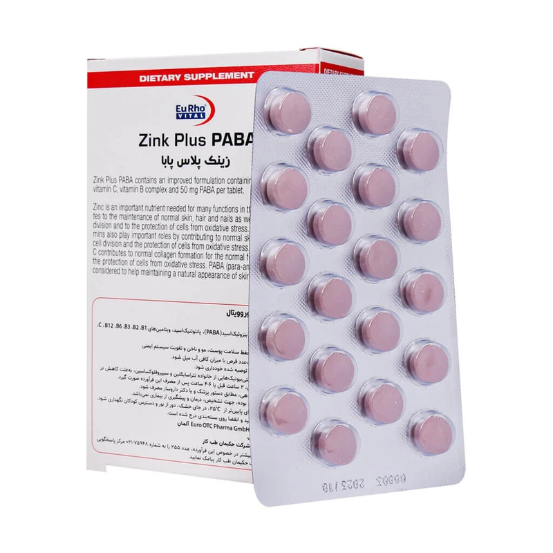 قرص زینک پلاس پابا یوروویتال 60 عددی مکمل تقویت پوست، مو و ناخن با ترکیب پابا برای رفع سفیدی مو و درمان بیماریهای پوستی